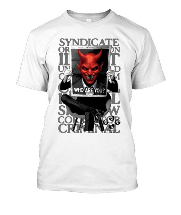 Un design provocatorio e d’impatto: un elegante uomo in abito nero nasconde il volto dietro un giornale, sul quale appare l’immagine inquietante di un diavolo rosso con un sorriso sinistro. La scritta WHO ARE YOU? sfida chi guarda, creando un contrasto tra anonimato, identità e verità nascosta. Perfetta per chi ama lo stile dark, urban e anticonformista.